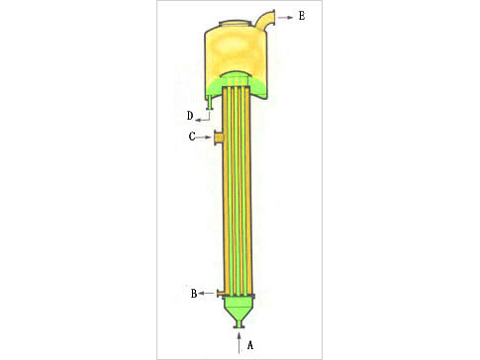 這種蒸發(fā)器的特征是具有長的加熱管(約為5~7M),但加熱室和沸騰室之間的溫度差也要大,否則,蒸汽流的能量不足于輸送液體和產(chǎn)生爬升的膜。